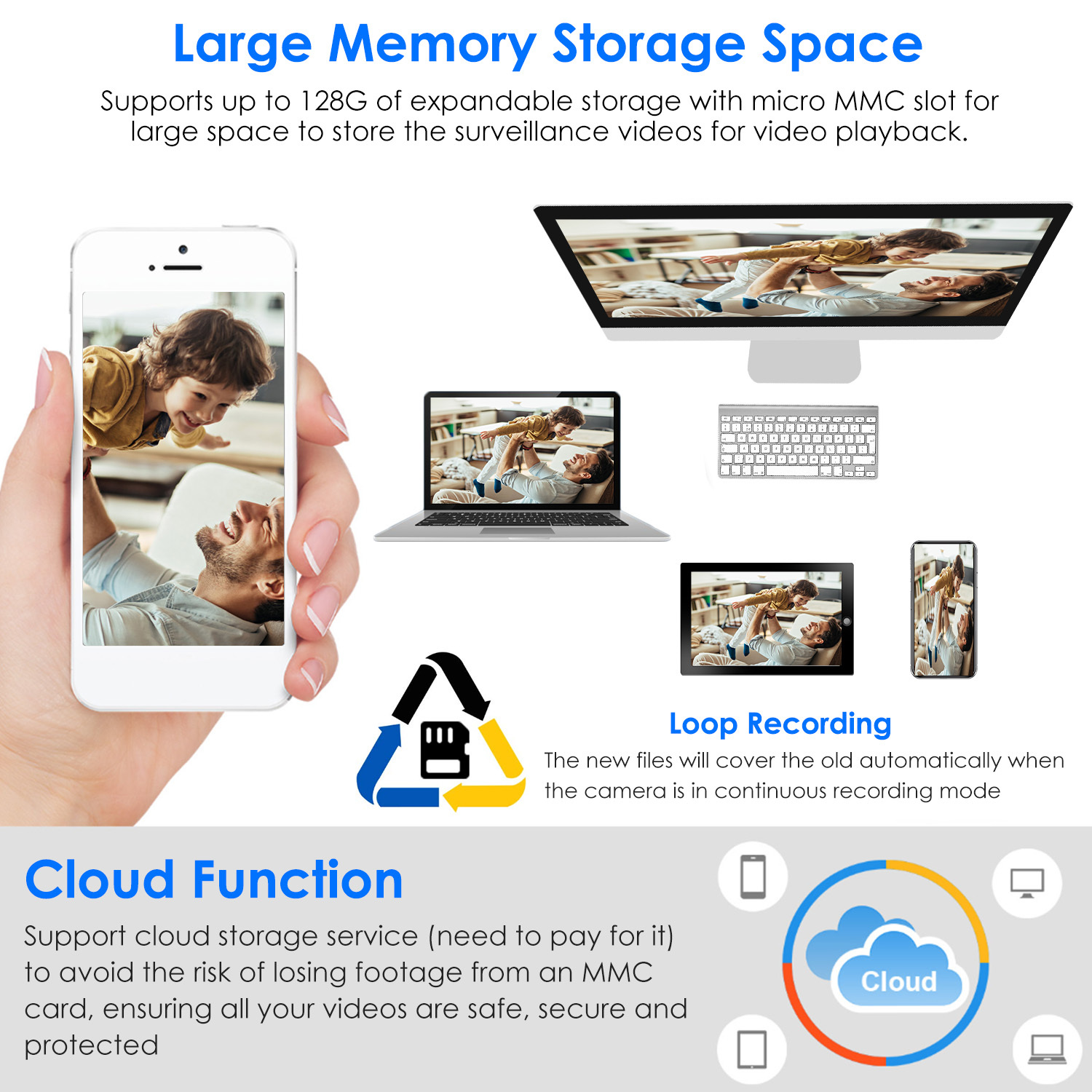 - * Flood Light & Night Vision *: Built-in flood lights will automatically turn on when the camera detects someone passing by during the night,then the picture will turn to be colorful. IR night vision function allows the camera to capture the scene in the dark and keeps you informed of any happenings even at night.